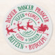 Festive holiday design features Santa and sleigh in centre with names of all the reindeer in circle pattern on light grey background.