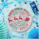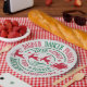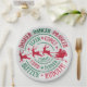 Festive holiday design features Santa and sleigh in centre with names of all the reindeer in circle pattern on light grey background.