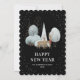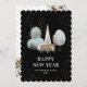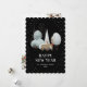 Cute black New Year card featuring a watercolor painting of a doe and a buck wearing a scarf in a snowy forest against a black background adorned with falling snow on the front and a watercolor painting of white poinsettia, conifer tree branches, holly and red berries at the back.
