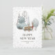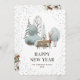 Cute New Year card featuring a watercolor painting of a doe and a buck wearing a scarf in a snowy forest against a plain white background adorned with falling snow on the front and a watercolor painting of white poinsettia, conifer tree branches, holly and red berries at the back.