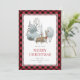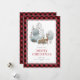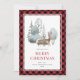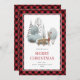 Cute red plaid watercolor Merry Christmas card featuring a watercolor illustration of a winter scene with doe and buck waring a scarf and ponsetia flower and Christmas lights tangled in his antlers. Easily personalise this rustic holiday card with your family name and text.