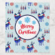 Bottle labels with a repeating pattern. Illustrated with a pair of blue scandinavian deer wearing red scarves. With decorative markings on their bodies. As well as a trio of red and blue christmas trees with a star on top. Fancy snowflakes sprinkled around. A circle layered over top which says Merry Christmas (editable so you can change to other text if you like) with some blue snowflakes.