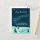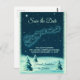 A Christmas party save the date postcard with a vintage illustration of Santa in his sleigh being pulled by his reindeers. Little stars sprinkle the night sky. Snow covered pine trees on the ground. Vintage retro feel.