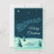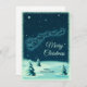 A holiday Christmas card with a vintage illustration of Santa in his sleigh being pulled by his reindeers. Little stars sprinkle the night sky. Snow covered pine trees on the ground. Vintage retro feel.