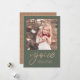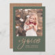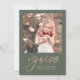Simple and festive rejoice and be glad religious Christmas card features one photo and pretty rejoice script on a green background, with a unique rustic burlap look back of card.