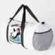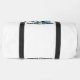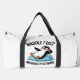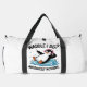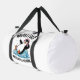 This white duffle bag features a charming cartoon of a relaxed penguin wearing headphones and lying on an ice floe, with the text "WADDLE I DO?" above and "ABSOLUTELY NOTHING." below. This humourous design is perfect for those who love to relax and enjoy their downtime. Edit colour of the bag caps and body in the Design tool to your favored colours.