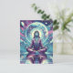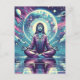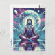Meditation postcard. A beautiful serene relaxing ai illustration of a blue and purple scene with a woman medicating in front of the moon, planets, stars and galaxy to give you a peaceful vibe. Pretty for a meditation room or a yoga studio.