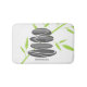 Relaxing zen pebble stone art bath mat design. Classy bathroom decor. Elegant handwritten typography template. Cute wedding or birthday gift idea for men and women. Pretty chic interior decoration for bath room. Zen pebble stones stacking and green bamboo leaves with personalised text.