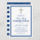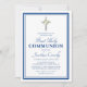 Boy's first holy communion invitation featuring a simple white background that can be changed to any colour, a navy blue double border, a religious silver cross with white flowers, and a holy communion template that is easy to personalise. The back features blue and white nautical stripes, and silver glitter.
