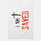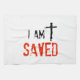 This design features the Christian phrase, "I am saved" in red and black letters, along with a black cross.