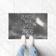 This is a cool dark cloud print large doormat that says 'REMOVE YOUR SHOES BEFORE COMING IN' in big white letters. Hopefully, everyone will be barefooted already when you open the door!
