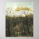 Beyond a dense screen of stylised, dark brown tree trunks, bending branches, and sage and moss-green leaves, a man and woman ride side-by-side on horseback and embrace in this vertical landscape painting.