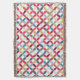 A repeat circular quarters cut out style patterned throw in warm tonal colours of red, browns, grey and blue on a white background by Sarah Trett. Would look great in a bedroom, lounge room.