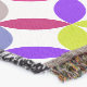 A repeat circular quarters cut out style patterned throw in bright purple, lime green, grey and blue, by Sarah Trett. Would look great in a bedroom, lounge room.