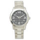 This women's watch has a mid-century modern design of a small oval inside a bigger oval on a field of black.