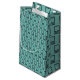 This gift bag has a mid-century modern design of squares with a line and a line of circles, all black, repeating across the design on a field of seafoam. If you like the design but prefer different colours, message me.