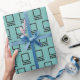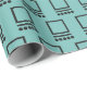 This wrapping paper has a mid-century modern design of squares with a line and a line of circles, all black, repeating across the design on a field of seafoam. If you like the design but prefer different colours, message me.