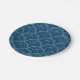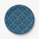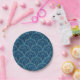 Repeating geometric Art Deco pattern with teal lines and orange dots on a dark blue background, creating a symmetrical and elegant design.