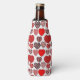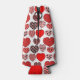 This bottle cooler has a Valentine’s design of repeating hearts with different graphics inside on a field of white.