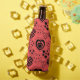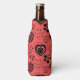 This bottle cooler has a Valentine’s design of repeating hearts with different graphics inside on a field of red.