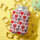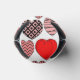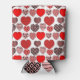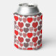 This can cooler has a Valentine’s design of repeating hearts with different graphics inside on a field of white.