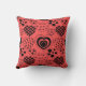 This throw pillow has a Valentine’s design of repeating hearts with different graphics inside on a field of red.