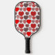 This pickleball paddle has a Valentine’s design of repeating hearts with different graphics inside on a field of white.