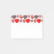 This Post-It notepad has a Valentine’s design of repeating hearts with different graphics inside on a field of white.