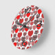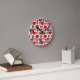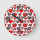 This wall clock has a Valentine’s design of repeating hearts with different graphics inside on a field of white.