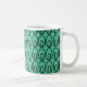 This mug has a mid-century modern design of a small oval inside a bigger oval on a field of mint green.