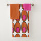 This towel set has a pink washcloth, an orange hand towel, and a bath towel with a mid-century modern design of repeating orange ovals with pink ovals inside.
