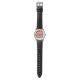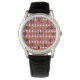 This men's watch has a mid-century modern design of repeating orange ovals with pink ovals inside.
