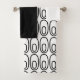 This towel set has a white washcloth, a black hand towel, and a bath towel with a mid-century modern design of a small oval inside a bigger oval on a field of white.