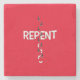 Downward footprints cross the word REPENT then turn to go upward creating a Christian cross.