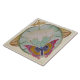 This tile features an aerial view of a butterfly above a lily over a lily pad in a bold yet delicate stylised design in soft shades of aqua, white, gold, and green as foils to the bright fuchsia, orange, peacock and black of the butterfly.