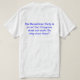 Shirt front: "Republicans claim government doesn't work and, when elected to Congress, prove it. (Paraphrase of P.J. O'Rourke) Shirt rear offers similar remark. Printed in "Republican blue", People may have been taught not to like Democrats, but they actually accomplish things other than preventing government from working or trying to turn the clock back to the "good ole days" when women had no vote and there was no such thing as civil rights and there was a class system, where Republicans were the have's and Democrats represented the have nots.