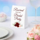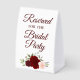 This simple tabletop sign will let your wedding guests know which areas are reserved for the bridal party. The beautiful boho chic design features elegant script lettering and a cluster of hand painted watercolor roses in shades of burgundy, red, and blush pink, along with sprigs of eucalyptus leaves and garden greenery.