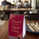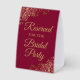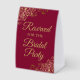 This simple tabletop sign will let your wedding guests know which areas are reserved for the bridal party. The simple burgundy, maroon, or wine-red and gold design features elegant script lettering with decorative curls and swirls in the corners.