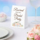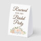 This simple tabletop sign will let your wedding guests know which areas are reserved for the bridal party. The beautiful boho chic floral design features elegant script lettering and a cluster of hand painted watercolor roses & blossoms in shades of coral, peach, and pale orange, with eucalyptus sprigs, leaves, and garden greenery tied with a white satin bow.