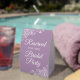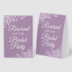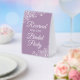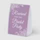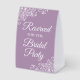 This simple tabletop sign will let your wedding guests know which areas are reserved for the bridal party. The beautiful light purple or lavender coloured design features elegant script lettering with decorative white curls and swirls in the corners.