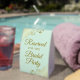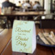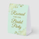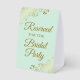 This simple tabletop sign will let your wedding guests know which areas are reserved for the bridal party. The simple pale mint green coloured design features elegant gold script lettering with decorative golden faux foil curls and swirls in the corners.
