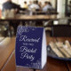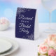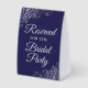 This simple tabletop sign will let your wedding guests know which areas are reserved for the bridal party. The simple navy blue and silver design features elegant script lettering with decorative curls and swirls in the corners.