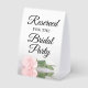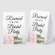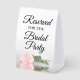 This simple tabletop sign will let your wedding guests know which areas are reserved for the bridal party. The classic timeless design features elegant script lettering and a single long-stemmed pale blush pink coloured rose lying on its side mirrored in a pool of water.