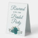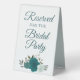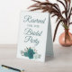 This simple tabletop sign will let your wedding guests know which areas are reserved for the bridal party. The beautiful boho chic design features elegant script lettering and a cluster of hand painted watercolor roses in shades of teal, turquoise, and aqua, along with sprigs of eucalyptus leaves and garden greenery.