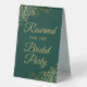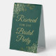 This simple tabletop sign will let your wedding guests know which areas are reserved for the bridal party. The simple emerald green and gold design features elegant script lettering with decorative curls and swirls in the corners.