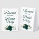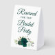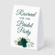 This simple tabletop sign will let your wedding guests know which areas are reserved for the bridal party. The beautiful boho chic design features elegant script lettering and a cluster of hand painted watercolor roses in shades of emerald olive, and mint green, along with sprigs of eucalyptus leaves and garden greenery.