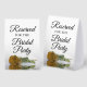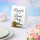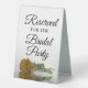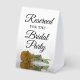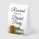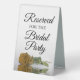This simple tabletop sign will let your wedding guests know which areas are reserved for the bridal party. The classic timeless design features elegant script lettering and a single long-stemmed gold ochre, goldenrod, or mustard yellow coloured rose lying on its side mirrored in a pool of water.