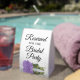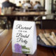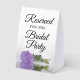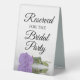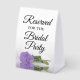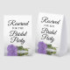 This simple tabletop sign will let your wedding guests know which areas are reserved for the bridal party. The classic timeless design features elegant script lettering and a single long-stemmed lavender purple coloured rose lying on its side mirrored in a pool of water.