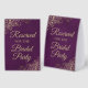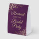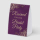 This simple tabletop sign will let your wedding guests know which areas are reserved for the bridal party. The simple plum purple and gold design features elegant script lettering with decorative curls and swirls in the corners.