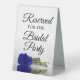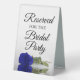 This simple tabletop sign will let your wedding guests know which areas are reserved for the bridal party. The classic timeless design features elegant script lettering and a single long stemmed royal blue or cobalt coloured rose lying on its side mirrored in a pool of water.